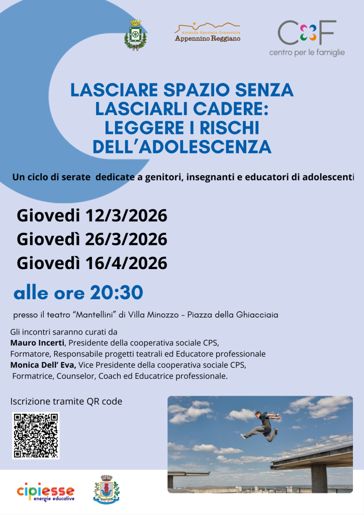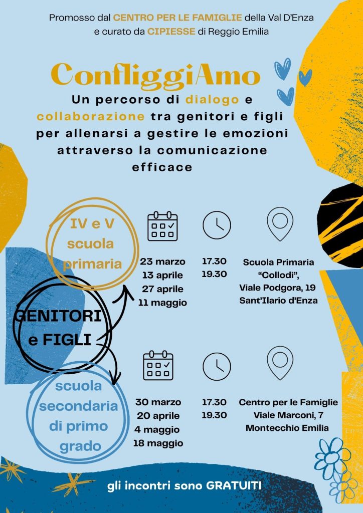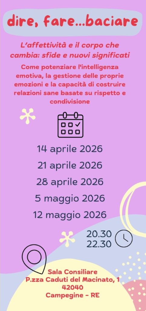 Percorsi rivolti ai genitori con figli dalla quinta elementare alle superiori per approfondire insieme tematiche educative L’affettività ed il corpo che cambia: Sfide e nuovi significati Come potenziare l’intelligenza emotiva e la gestione delle proprie emozioni e la capacità di costruire relazioni sane basate su rispetto e condivisione Promosso dal CENTRO PER LE FAMIGLIE della […]